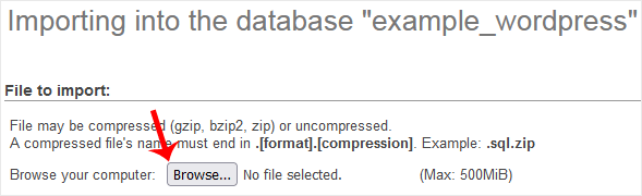 5. Under File to Import, click on Browse and select SQL file from your computer.